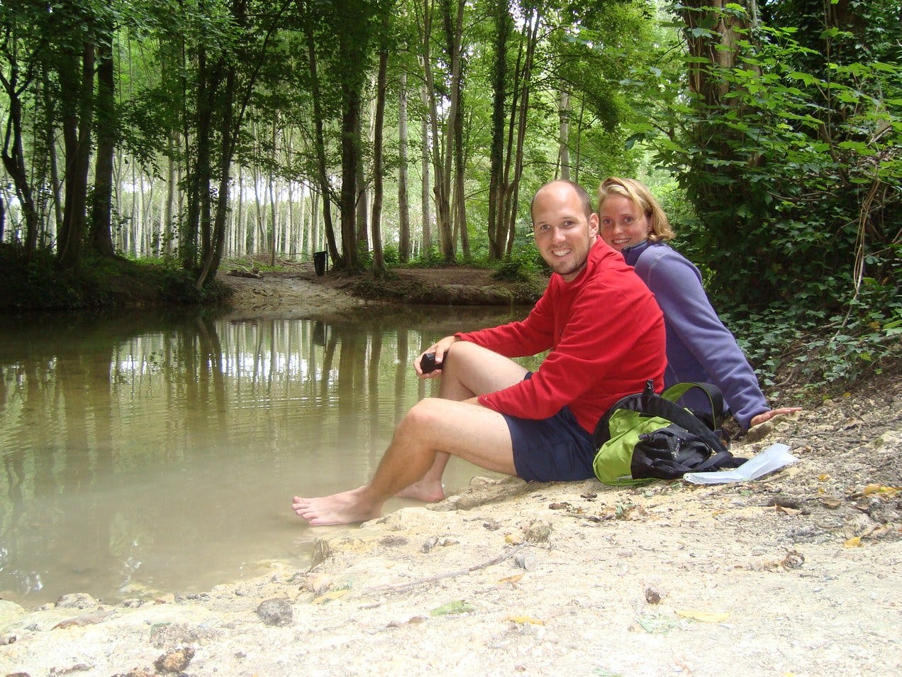 Na een moment van rust op de kamer, wandelen we naar een ven in het bos achter de boerderij. We hijsen de broek omhoog en slenteren wat door het water. Voor ons stappen drie prachtige volbloed Arabieren door het water en als kers op de taart een pezige oude man met een zwembroek uit zijn jeugdige jaren.