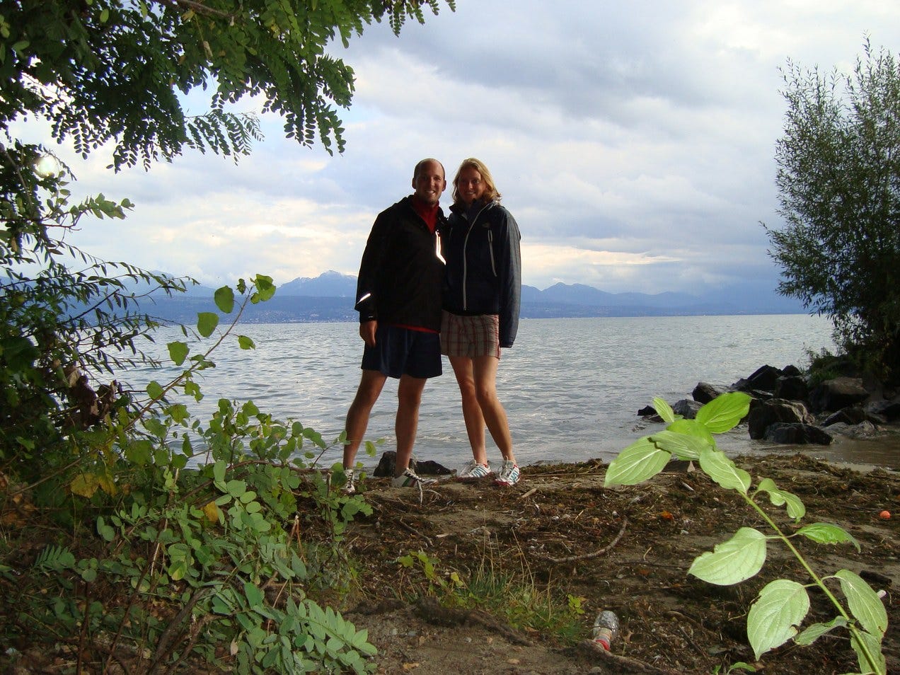 De avond is begonnen als we de laatste kilometers van bovenaf het meer Genève zien, met daarachter de enorme bergen van de Alpen en de 3D-stad Lausanne. We hebben kippenvel, maar niet van de kou. De deken van regen voor ons, de wolken en in de verte een twijfelende avondzon maakt het aanzicht machtig prachtig.