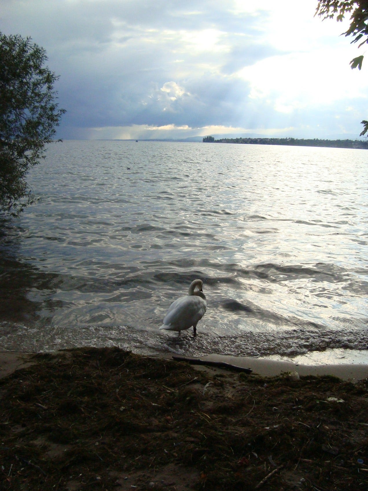 We dumpen onze spullen en springen onder de douche. Vermoeid rennen we naar het grootste binnenmeer van Europa. De regen is weg, de zon schittert prachtig over het kabbelende water dat soms, als er in de verte een schip vaart, overgaat in golven. Daarachter bergen.. Enorme bergen die haar ware aard verschuilt in de wolken.