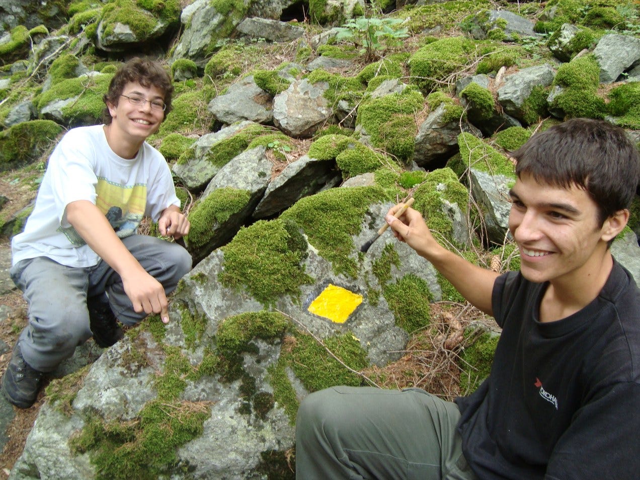Even later komen we het antwoord tegen: twee jongens die als vakantiebaan of taakstraf de tocht opnieuw aan het markeren zijn. Prettig. We moeten nog aan de echte klim beginnen en liggen voor op de signalering. De jongens zien er de lol niet van in en gaan geconcentreerd door.