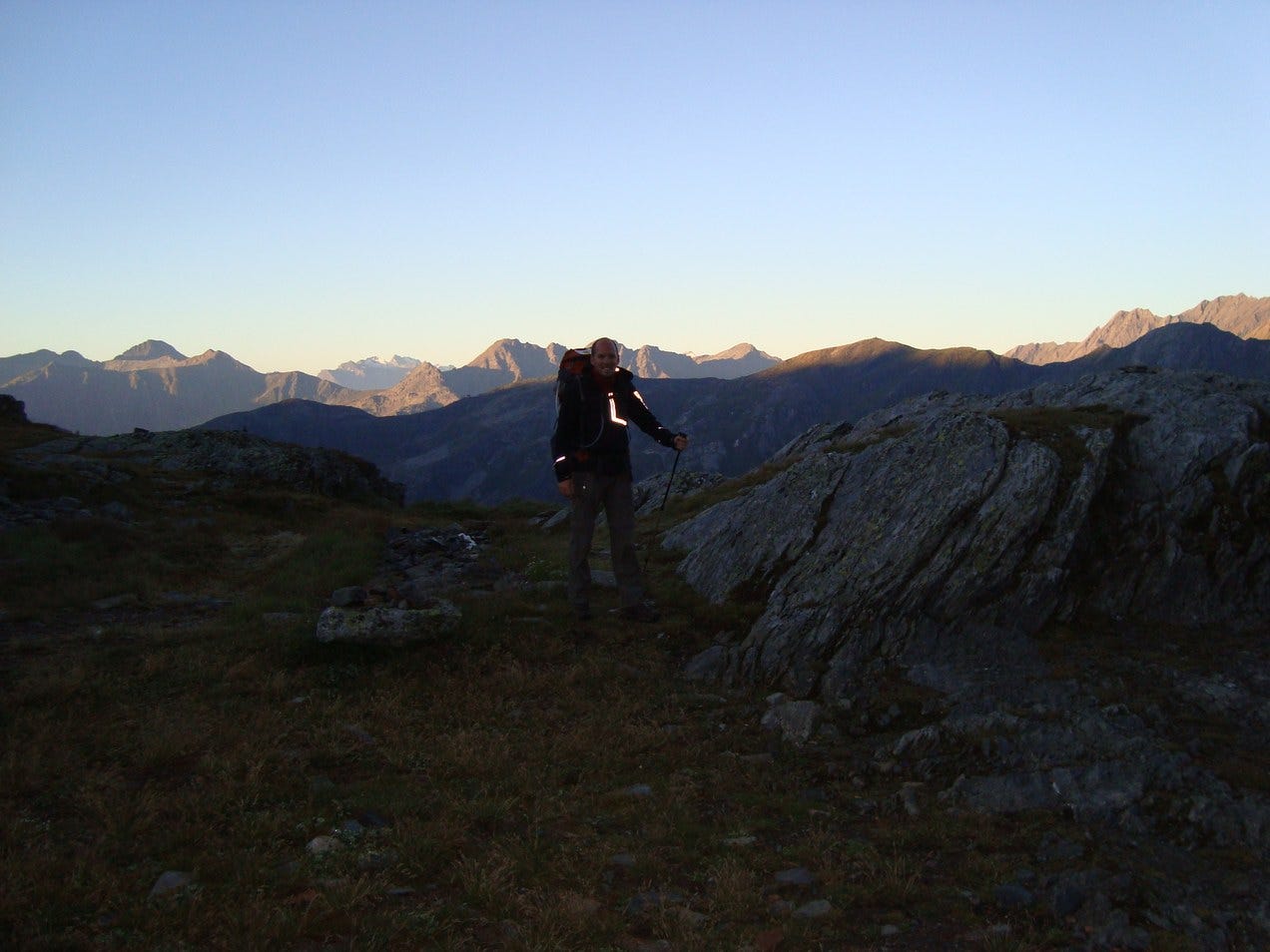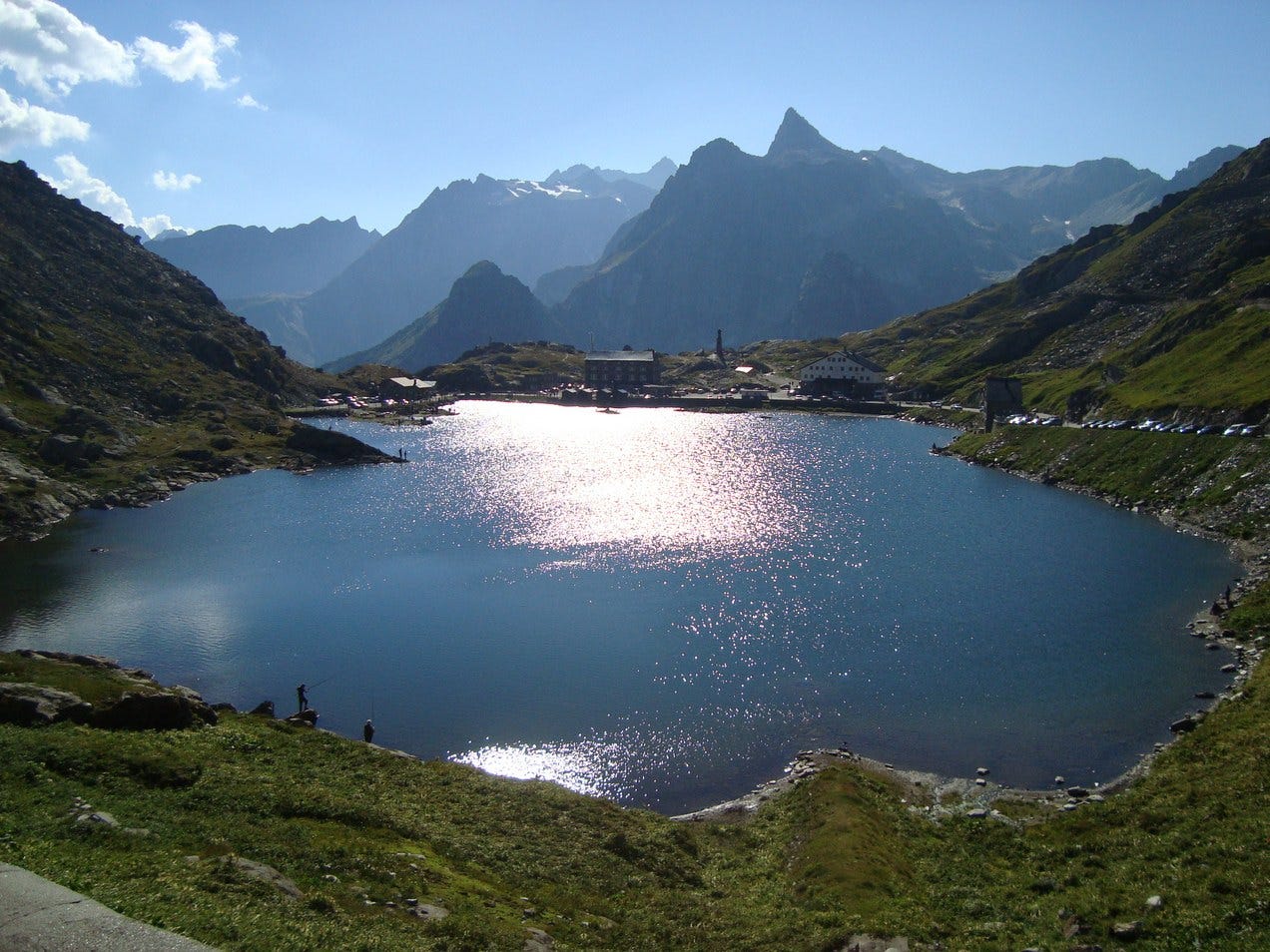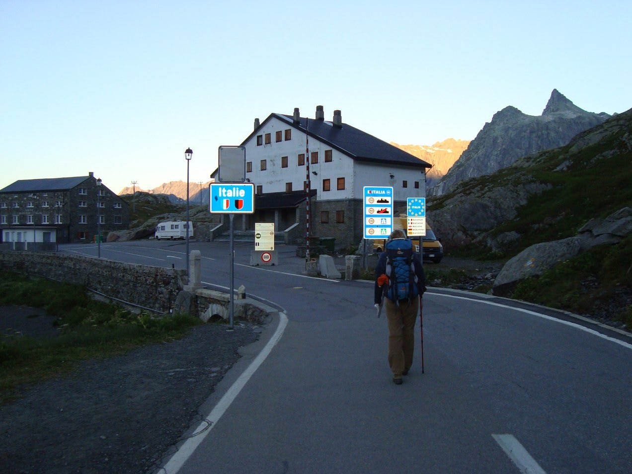 Enigszins brak staren we nu over een meer. Gisteren is dit totaal aan ons voorbij gaan dat er achter de hospice een schitterend meer ligt. Het is de scheiding tussen Zwitserland en Italië, prachtig. Het is nu half zeven en dat is een tijdstip dat je hier komt staren, zien we aan de andere vroegelingen rond het water.