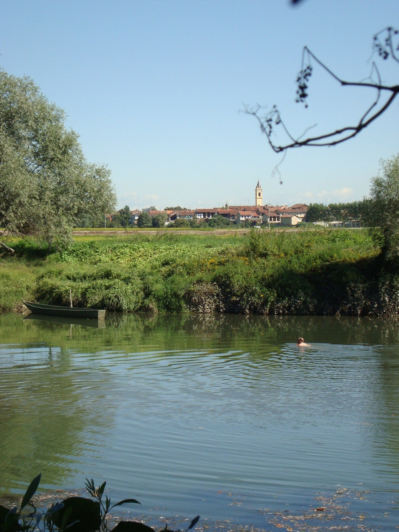 Na anderhalf uur lopen besluiten we even te rusten op dit eentonig stuk route. Het bord Rome 839km hebben we nog niet gezien, dit moet het signaal zijn waar we van het pad af moeten. Het is vroeg en warm, de dijk geeft geen schaduw, we zoeken beschutting onder een boom iets verderop.