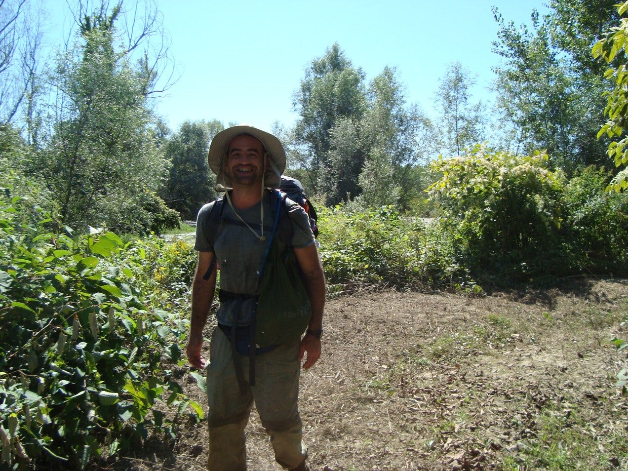 We lopen gezamenlijk door over de grote kiezelstenen, het pad loopt dichter langs de rivier. Deze verandering komt wel overeen met de kleine tekening die wij bij ons hebben. Na een tijdje lopen houden de kiezelstenen op en wordt het wat meer een graspad. Dit pad wordt langzaam groter en ook deze weg kent haar einde. We bestuderen de situatie en zien dat er een hoop oude bomen zijn omgevallen c.q. gezaagd en waarschijnlijk het pad versperren. We moeten in de richting van het zuiden, dus dan maar de lastige weg. Wij gaan zelfverzekerd voorop. Gewapend met loopstok banen we ons een pad door de oude bomen, dorre struiken, verrotte maïs en metershoge gras, achter ons de Canadees die nu volledig op ons vertrouwt.