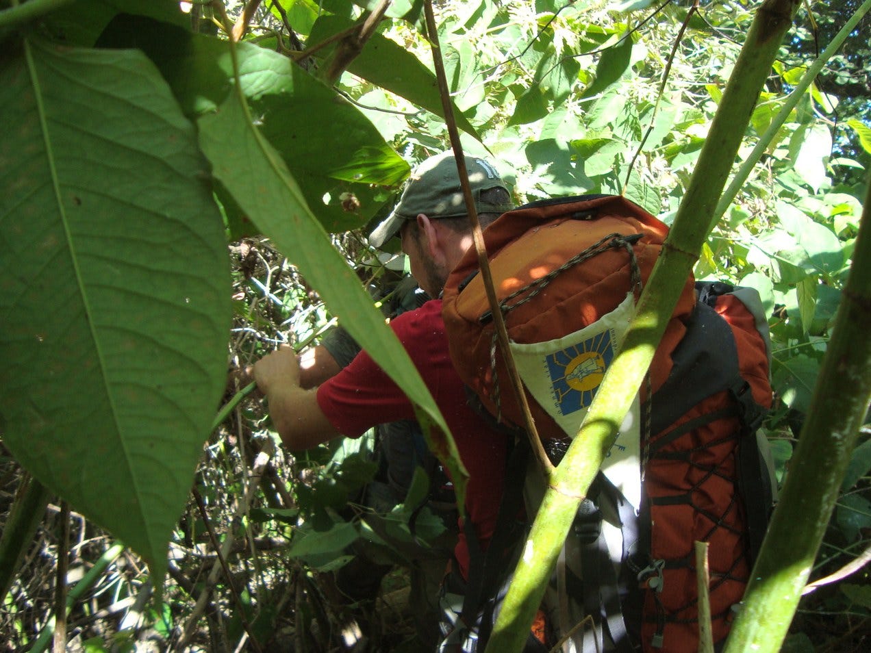 We lopen een half uur als de weg echt onbegaanbaar lijkt te worden. We zijn al redelijk grof te werk gegaan en dit is aan ons gezicht en benen af te lezen. De lange broek moet aan en we gaan door: met harde hand slaan we ons een weg door de rimboe. We besluiten meer naar links af te buigen waar dit in de beschrijving had moeten gebeuren. We lopen nog een half uur en beseffen dat het lastig gaat worden het juiste pad terug te vinden. Om ons heen staan huizenhoge takken en we lopen louter op gevoel en kompas.