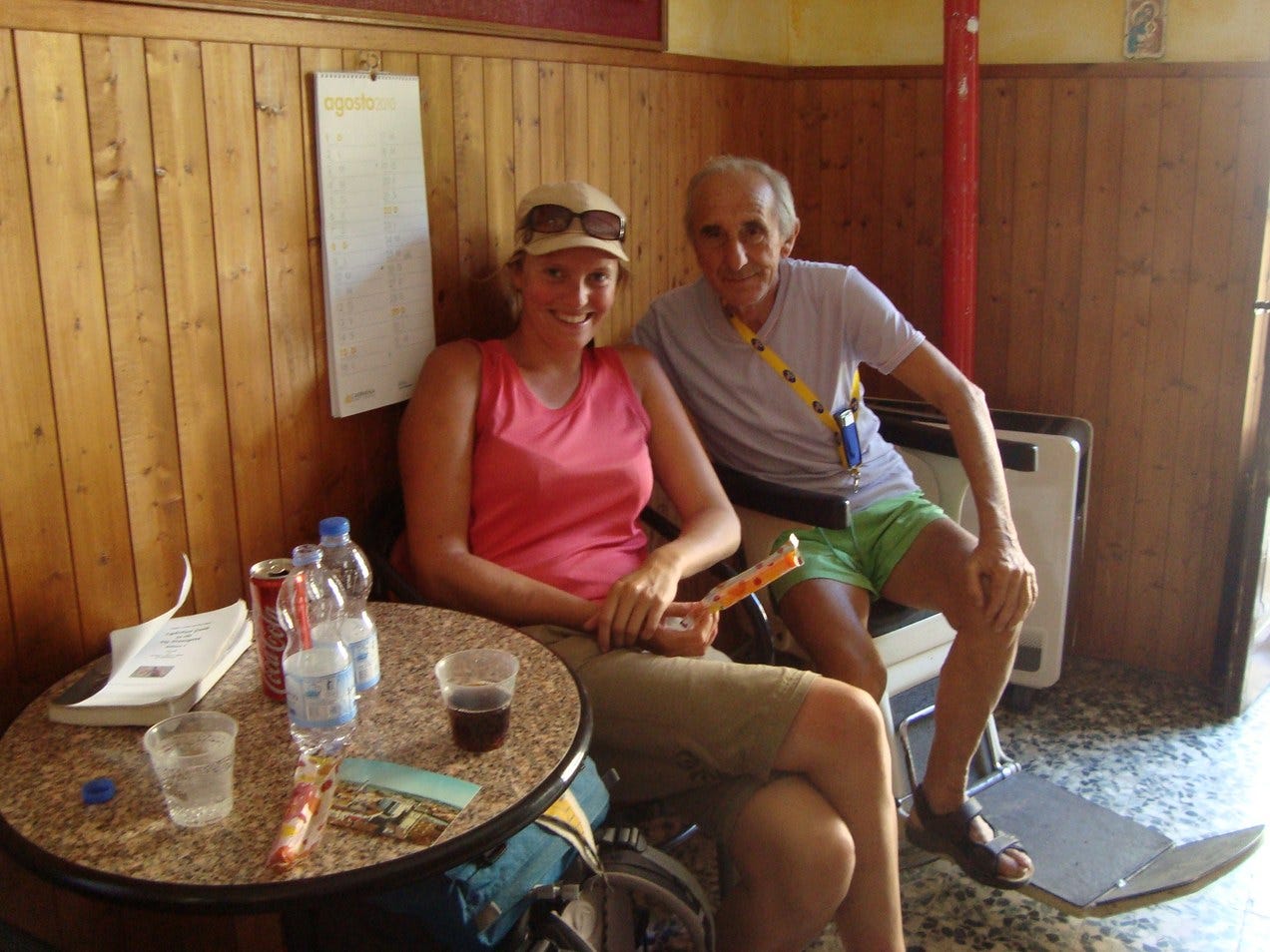 We gaan achter hem aan en in een klein kroegje geeft hij ons een colaatje, ijsjes, wat cake en flessen water. Hij heeft hier een vereniging opgezet voor pelgrims en is er dagelijks druk mee bezig. Met moeite voeren we een gesprek, maar profiteren met name van het moment van rust en het bijvullen van ons proviand. Als we alles in de buik en tas hebben gestopt, gaan we verder.
