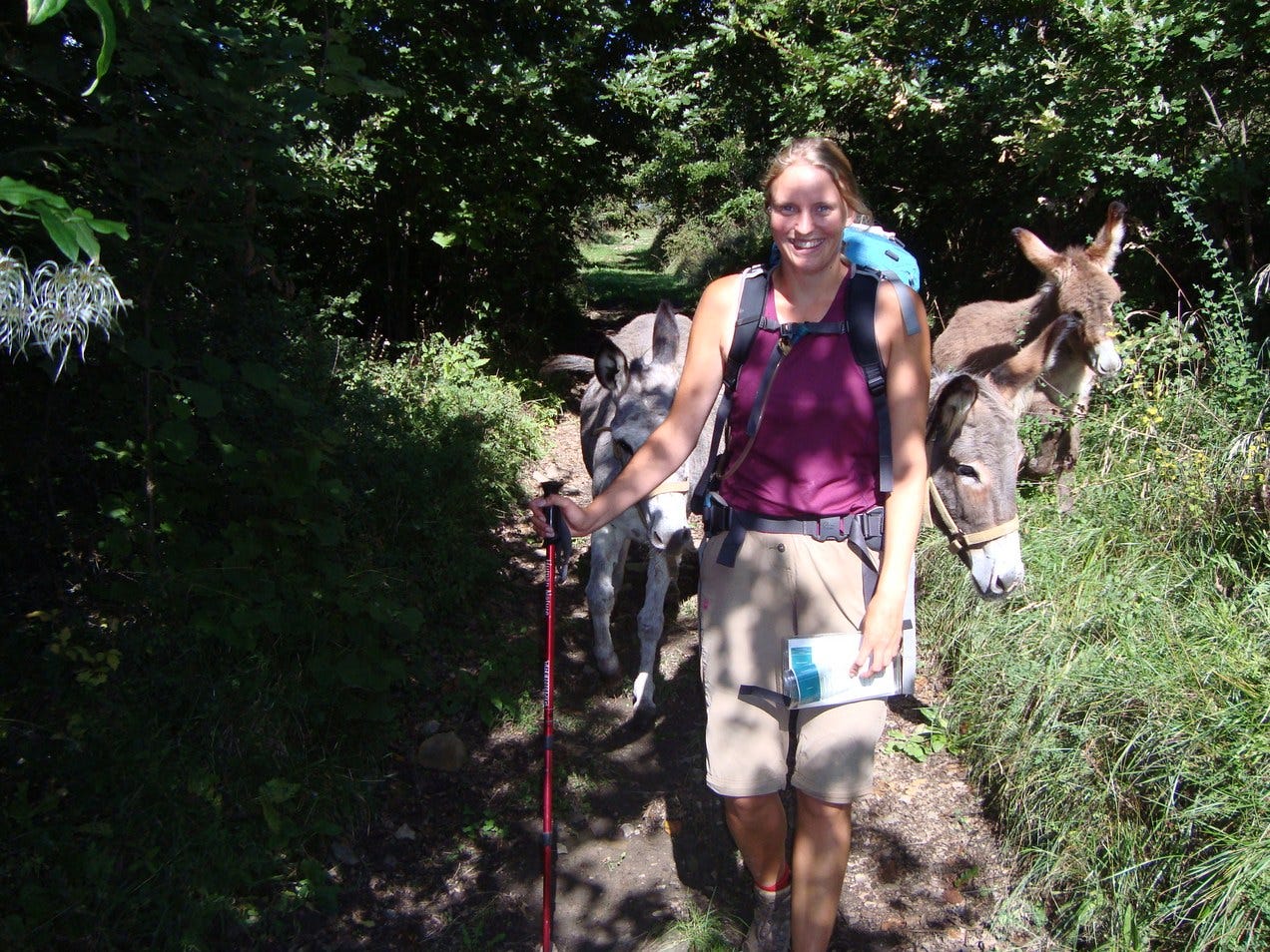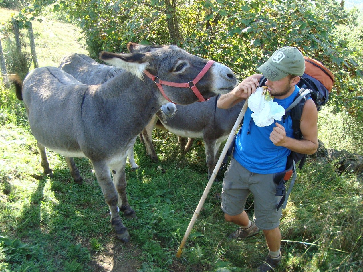 Vlak voor Berceto komen we op de top van een berg een groep ezels tegen. Ze vinden ons erg interessant. Vooral onze backpacks moeten het ontgelden, ieder ritsje en touwtje wordt in de bek genomen. Omdat ze tevens de weg naar beneden versperren, probeert Ewout ze af te leiden met brood. Ze storten zich massaal op hem, deze man heeft vast een tas vol brood. Ze worden agressiever en wij nemen dit over, we bewegen wild en jagen ze zo weg.