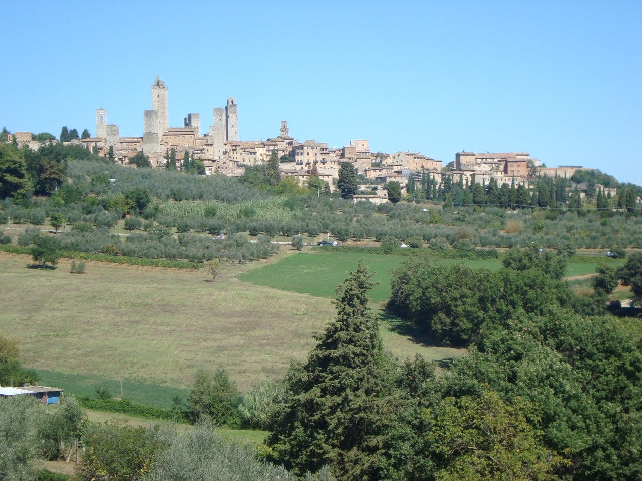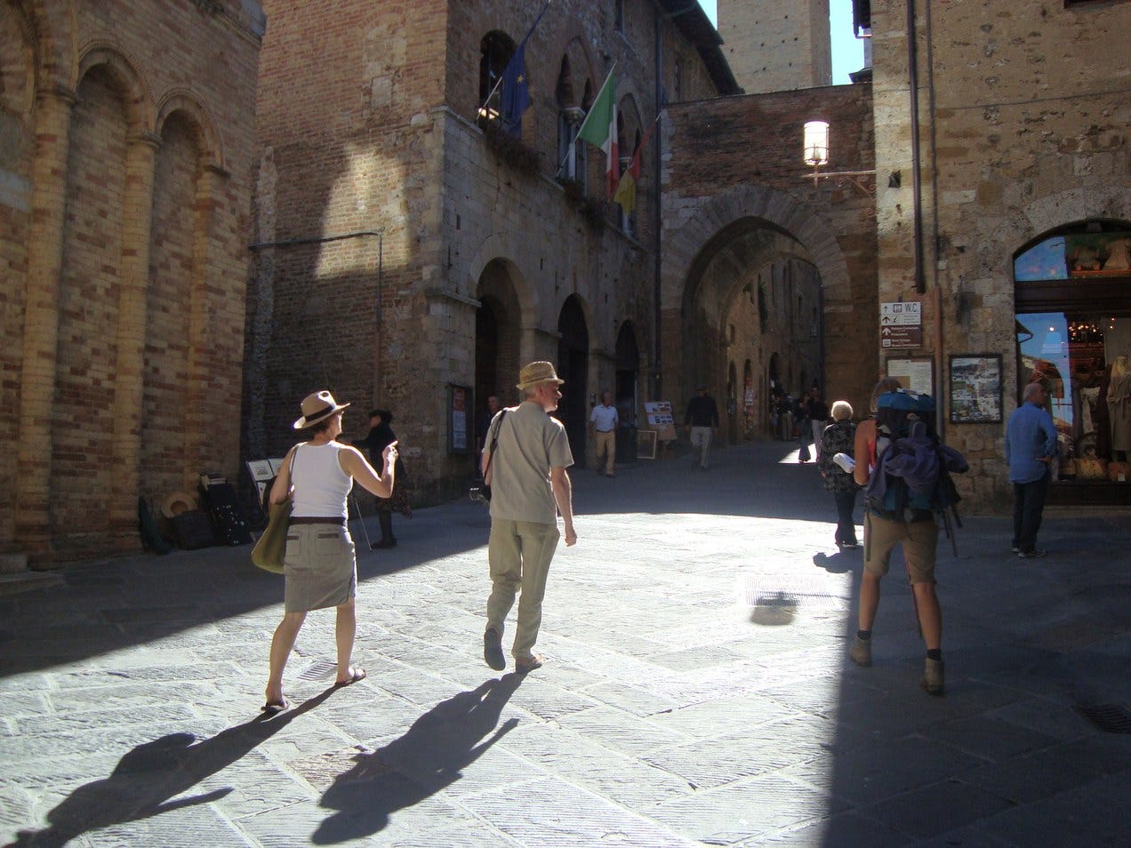 We richten ons op San Gimignano, de tussenstop na 14 kilometer. We klimmen in de richting van de vijf torens die we al even gebruiken als kompas. Ooit waren dit veertien torens waar rijke families in woonden. We gaan niet hard en kijken onze nek scheef. Ondertussen worden we toeterend ingehaald door bussen met toeristen die – net als wij – op weg zijn naar het historische centrum dat sinds de jaren negentig Unesco Werelderfgoed is.