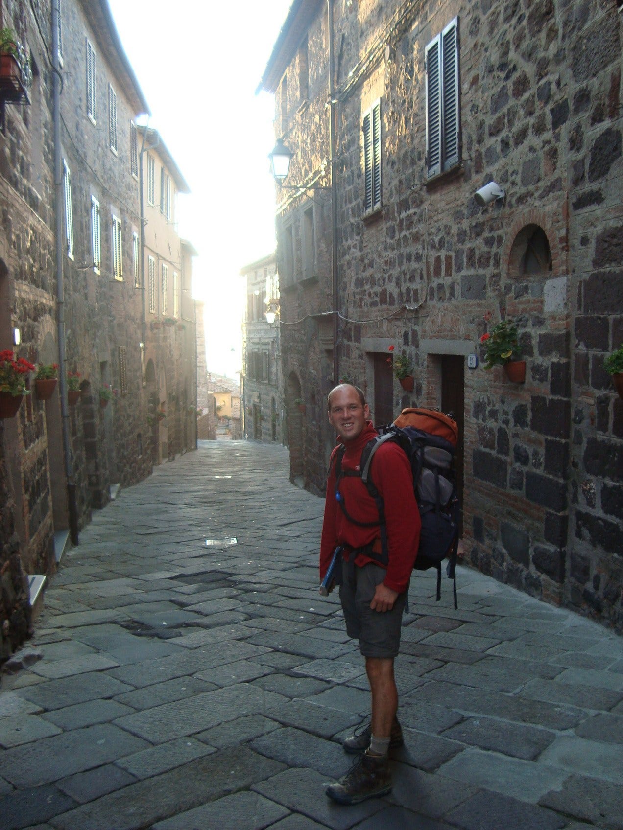 Behalve deze ruis gaat de dag wonderbaarlijk goed. We mogen met dank aan het stijgen van gisteren veel dalen over prettige wegen. Het enige nadeel is onze bevoorrading. We hebben te weinig brood ingekocht en natuurlijk was er in het dorp niets te krijgen op deze zondagmorgen, en we komen kilometers lang geen dorp tegen. Onze eerste, echte kans op eten is in Proceno, zo’n 6 kilometer voor Aquapedente. We lopen nu een dag op Tucjes en mueslirepen, het verzadigt niet.