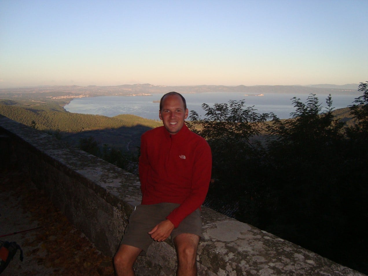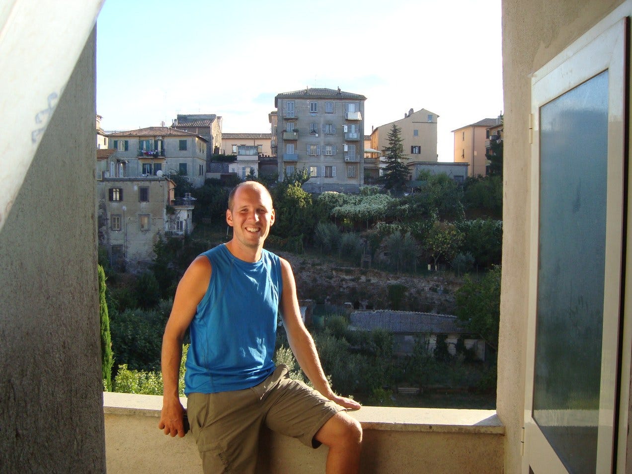 We ontbijten in een grote tuin op het hoogste punt van de stad, omringt door een stadsmuur kijken we uit naar Vitterbo, waar we heen gaan. Het is hier stil, de stad lijkt ver weg.