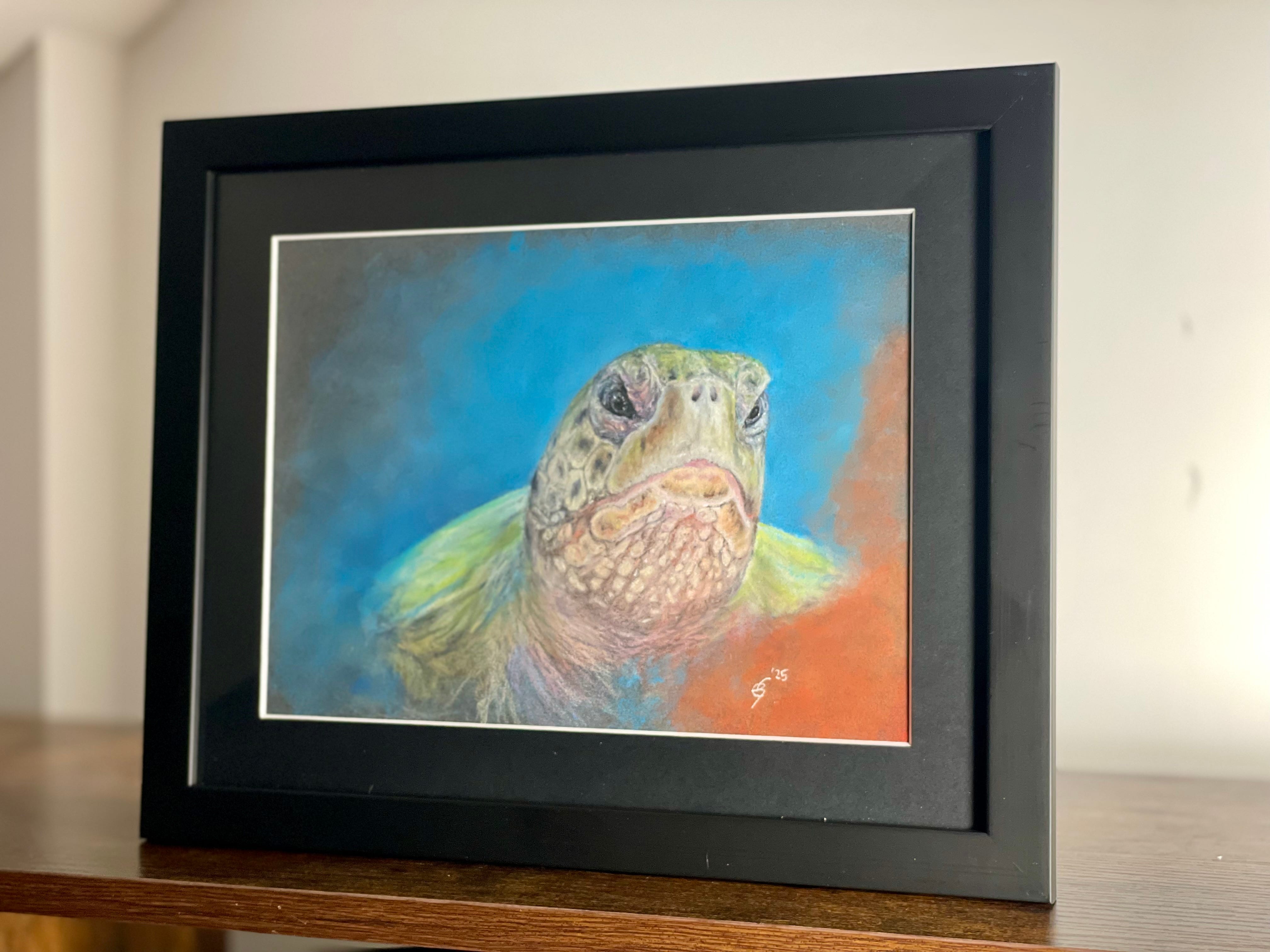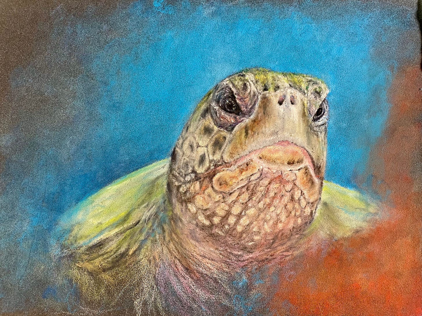 Ik maakte deze tekening van een tropische zeeschildpad. Met haar elegant gebogen, bijna vogelachtige snavel komt ze op je af gezwommen; de wereld om haar heen lost op in blauw en koraalkleuren en haar blik blijft hangen (althans bij mij).